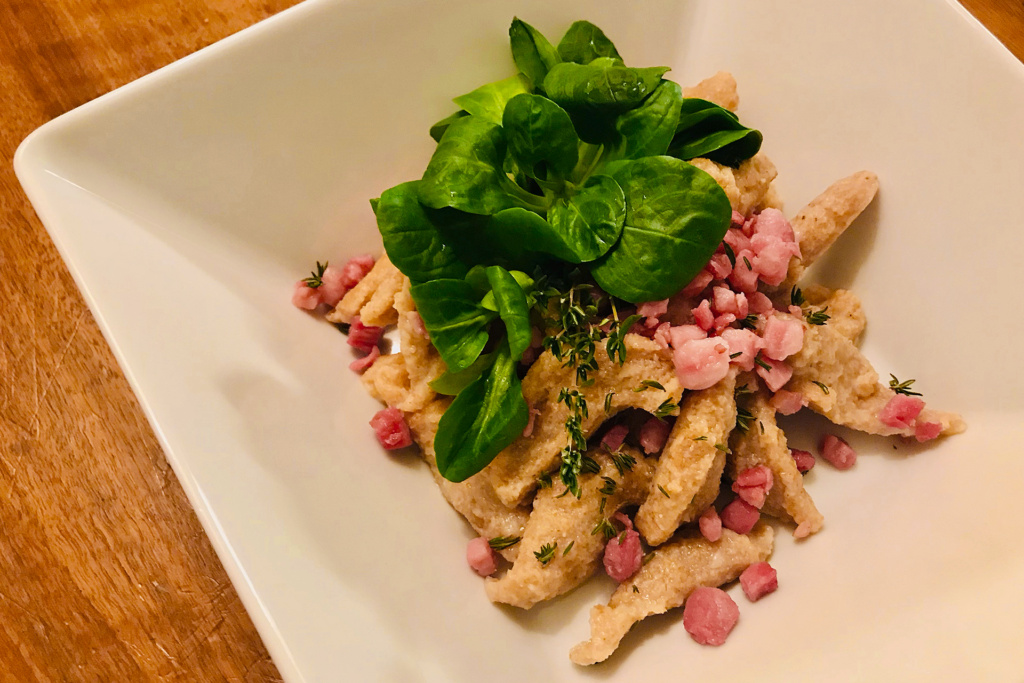 6Die Spätzli mit Speckwürfeln, Thymian und Nüsslisalat anrichten.