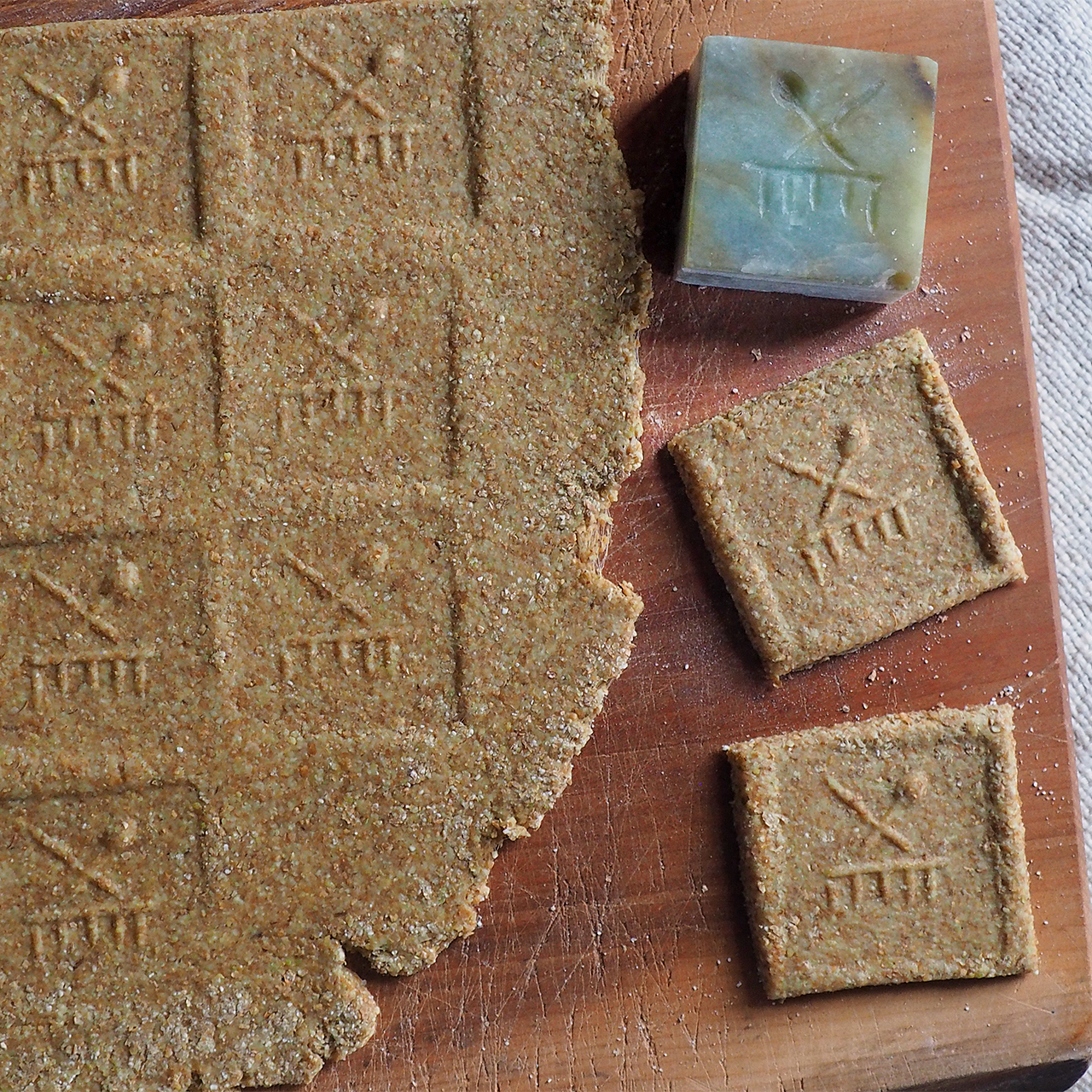 Mit Anisguetzli oder Springerle haben diese Knabbereien geschmacklich nicht allzu viel gemeinsam. Anis, Puderzucker und Weissmehl sind nicht pfahlbaukonform – und Eier in der Wintersaison nicht verfügbar. Wir ersetzen die Zutaten durch Dillsamen, Honig, Erbsenmehl und gesiebtes Vollkornmehl oder Halbweissmehl. In jungsteinzeitlichen Siedlungen, unter anderem dem Pfahlbau Isolino Virginia im Lago di Varese (I), haben Forscher*innen Stempel aus Ton, sogenannte Pintadera, gefunden. Sie tragen Wellenlinien, konzentrische Kreise, Punkte, Spiralen und viele andere Muster. Archäolog*innen gehen davon aus, dass die Pfahlbauer*innen diese Stempel zum Verzieren von Kleidern, Keramik, der Haut oder Brot eingesetzt haben. Oder auch für süsse Flachgebäcke mit Pottasche und Hirschhornsalz, wer weiss?