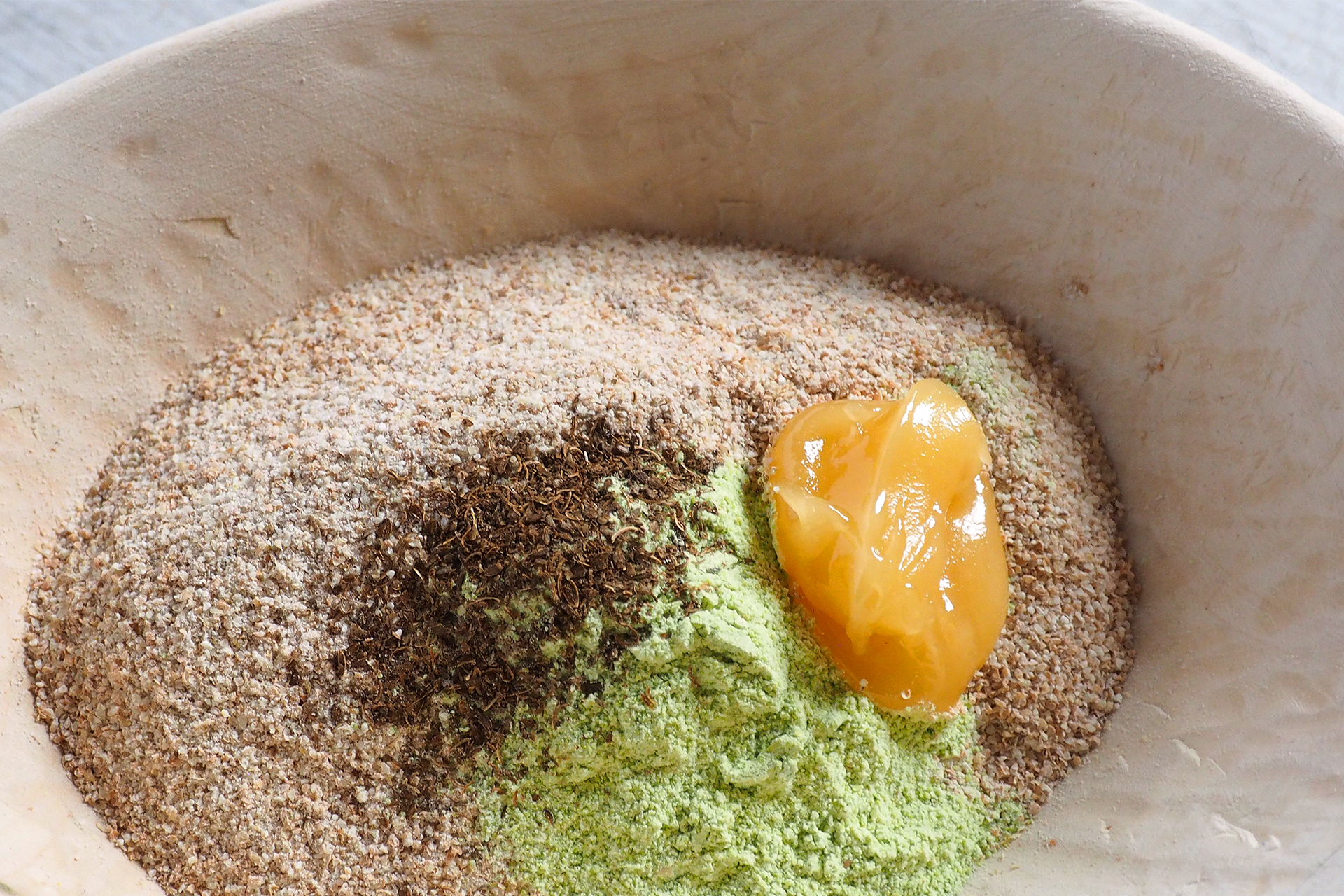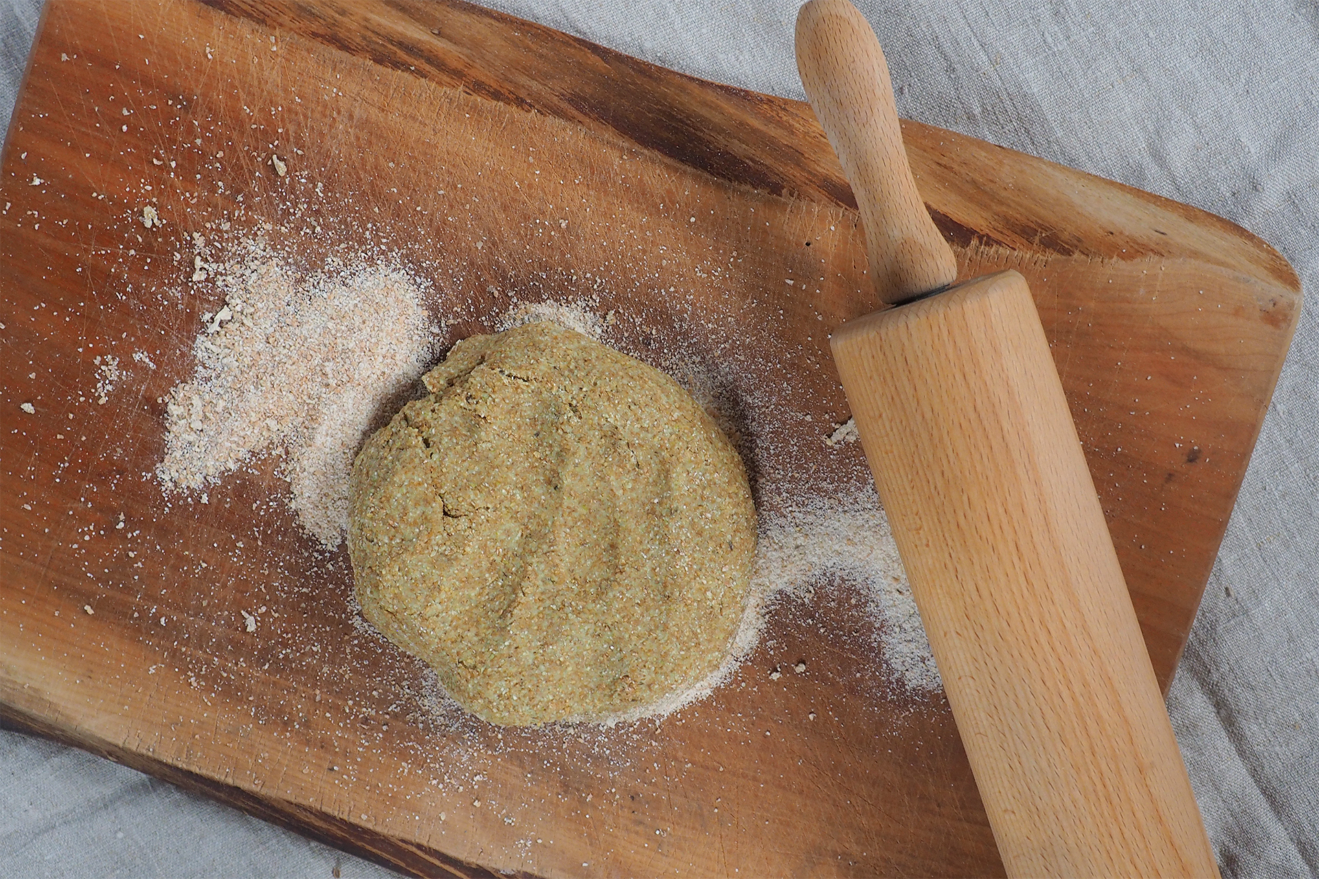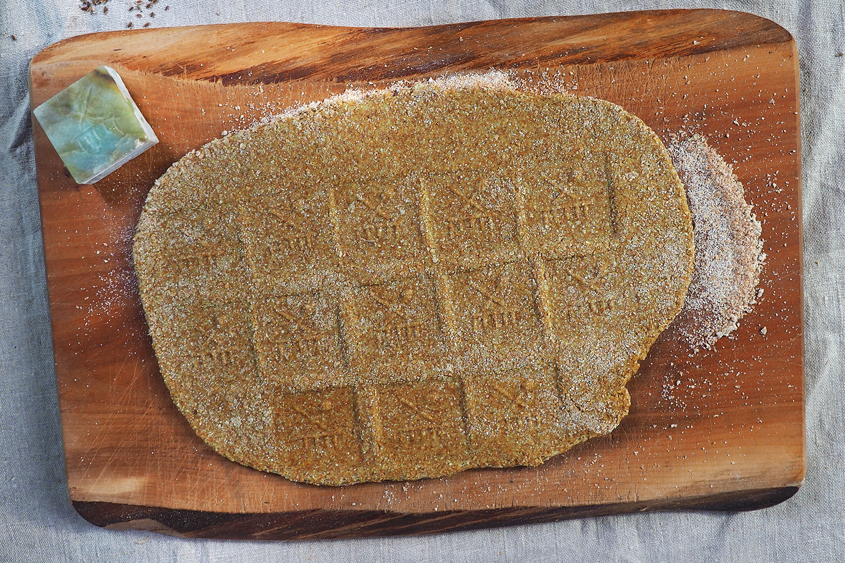 Das Mehl mit Wasser, Hirschhornsalz, viel Honig, fein gemahlenen Dillsamen, etwas Erbsenmehl und einer Prise Salz zu einem elastischen Teig vermengen.