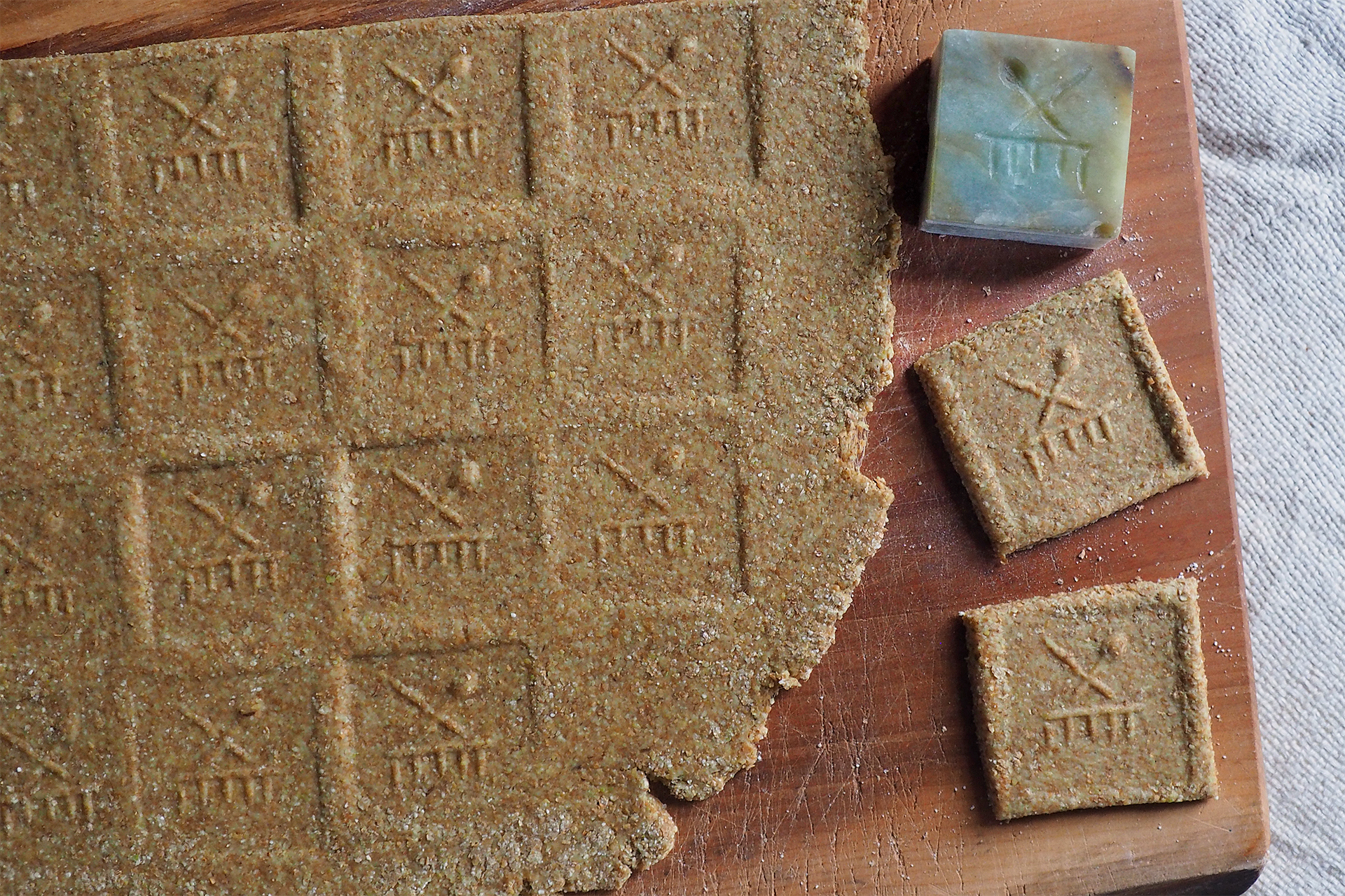 Mit Anisguetzli oder Springerle haben diese Knabbereien geschmacklich nicht allzu viel gemeinsam. Anis, Puderzucker und Weissmehl sind nicht pfahlbaukonform – und Eier in der Wintersaison nicht verfügbar. Wir ersetzen die Zutaten durch Dillsamen, Honig, Erbsenmehl und gesiebtes Vollkornmehl oder Halbweissmehl. In jungsteinzeitlichen Siedlungen, unter anderem dem Pfahlbau Isolino Virginia im Lago di Varese (I), haben Forscher*innen Stempel aus Ton, sogenannte Pintadera, gefunden. Sie tragen Wellenlinien, konzentrische Kreise, Punkte, Spiralen und viele andere Muster. Archäolog*innen gehen davon aus, dass die Pfahlbauer*innen diese Stempel zum Verzieren von Kleidern, Keramik, der Haut oder Brot eingesetzt haben. Oder auch für süsse Flachgebäcke mit Pottasche und Hirschhornsalz, wer weiss?