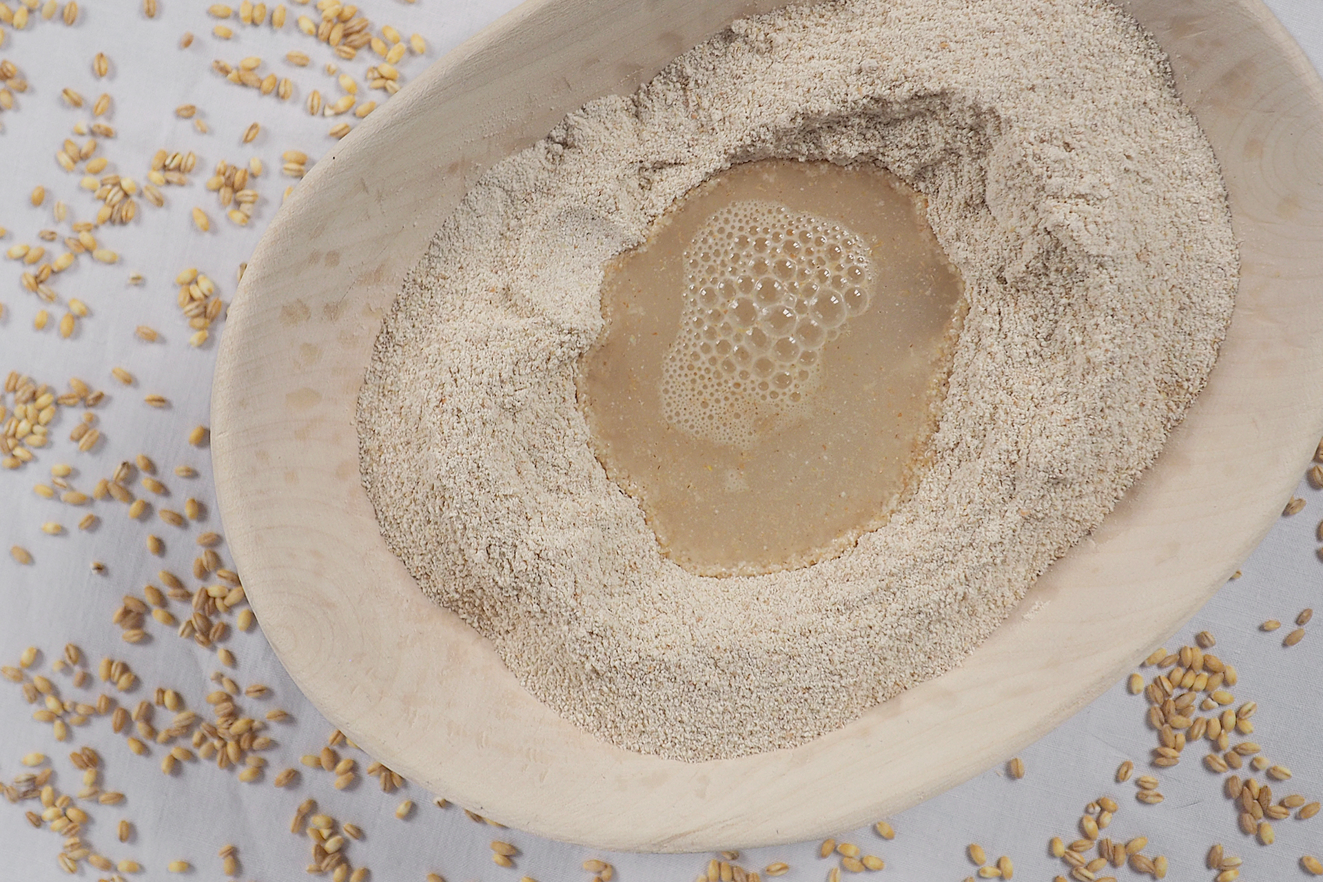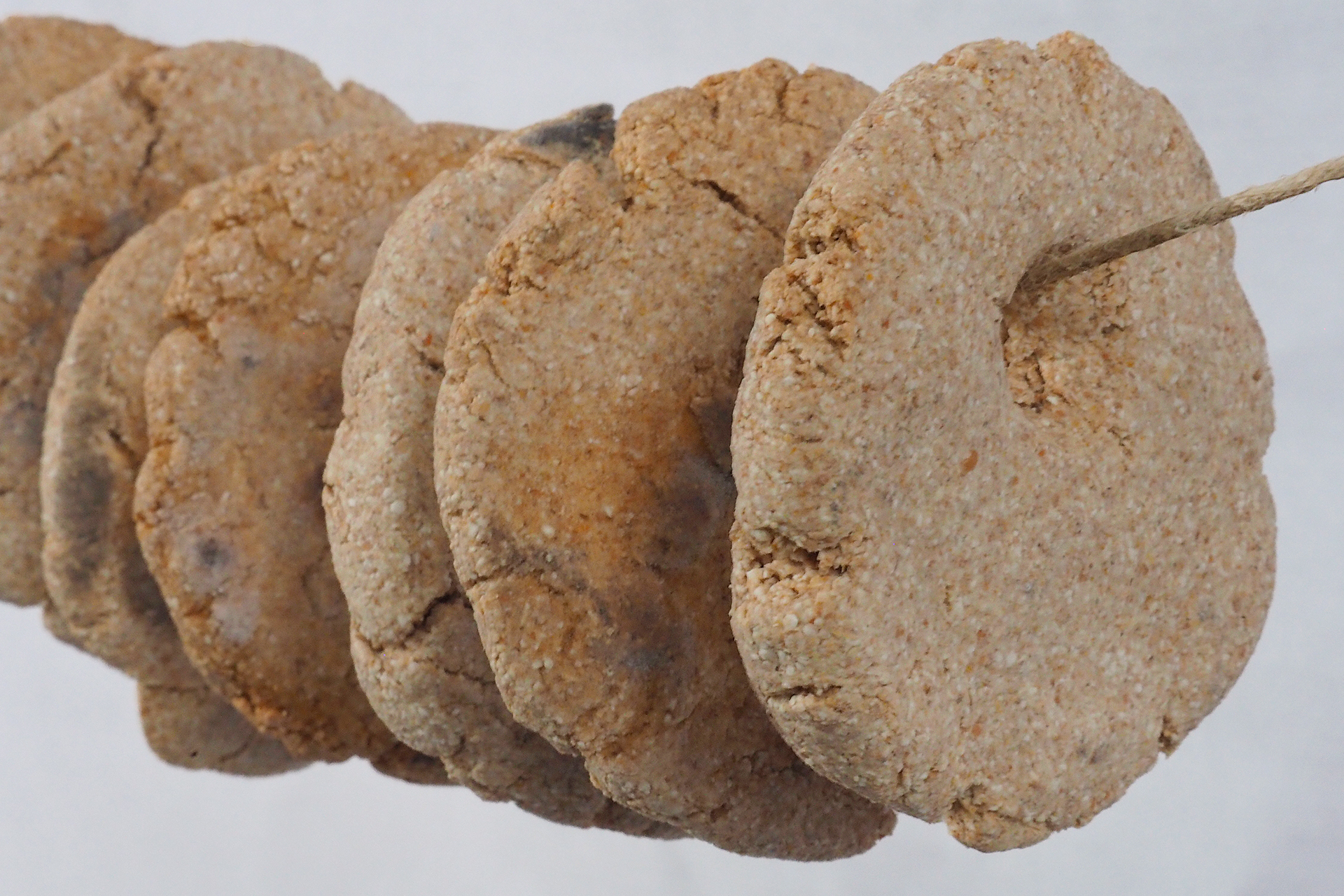 Aus reinem Gerstenmehl einen zusammenhängenden, elastischen Teig herzustellen ist nicht möglich. Deshalb empfehlen wir dir eine Mischung mit Weizen, Emmer oder Einkorn, die gut binden. Wird mehr als zur Hälfte Gerstenmehl verwendet, verhält sich der Teig wie ein störrischer Mürbeteig, der nur mit Feingefühl in die gewünschte Form gebracht werden kann. Auswallen oder allzu sehr flach klopfen funktionieren nicht. So ergeben sich automatisch Fladenbrote, die den Originalfunden im Aussehen sehr nahe kommen.