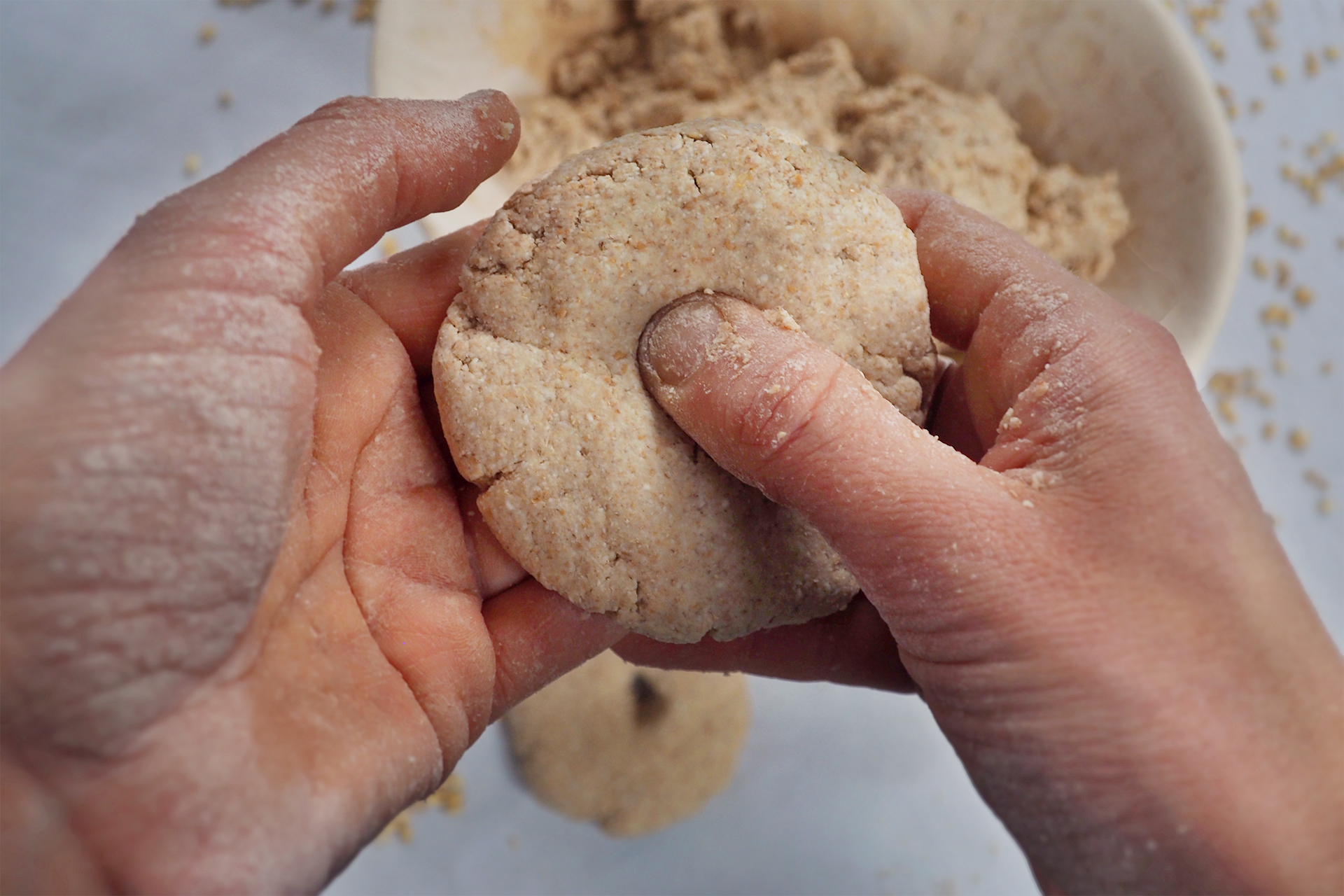 Portionenweise kleine, etwa daumendicke Fladen zwischen den Händen formen.