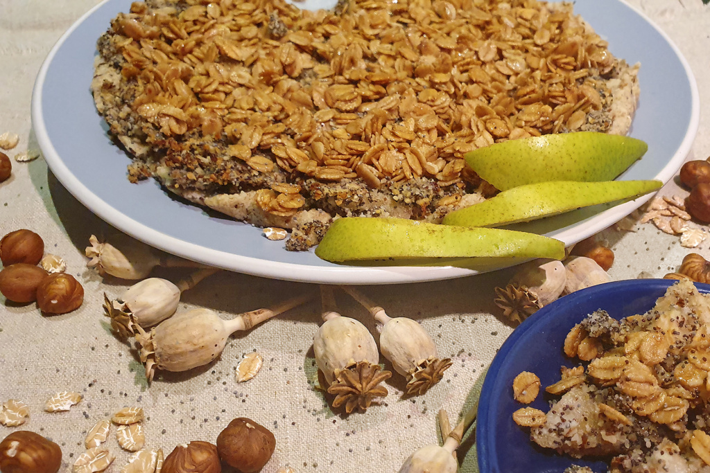 Milch oder Eier standen den Pfahlbauer*innen im Winter nicht zu Verfügung. Im Alpenraum ist das eine ganz schön lange Zeit ohne Kuchen. Diesen kann man aber auch aus anderen Zutaten backen – solchen, welche die Pfahlbauer-Bäcker*innen schon das ganze Jahr in der Vorratskammer hatten. Wir backen den köstlichen Kuchenboden aus Griess und belegen ihn einfach mit dem, was noch vorrätig ist. In diesem Rezept ist das eine dicke Schicht aus Birnen, Nüssen und Mohn. Oben drauf kommen mit Honig gesüsste knusprige Getreideflocken und fertig ist dieser perfekte Pfahlbauer*innen-Kuchen.