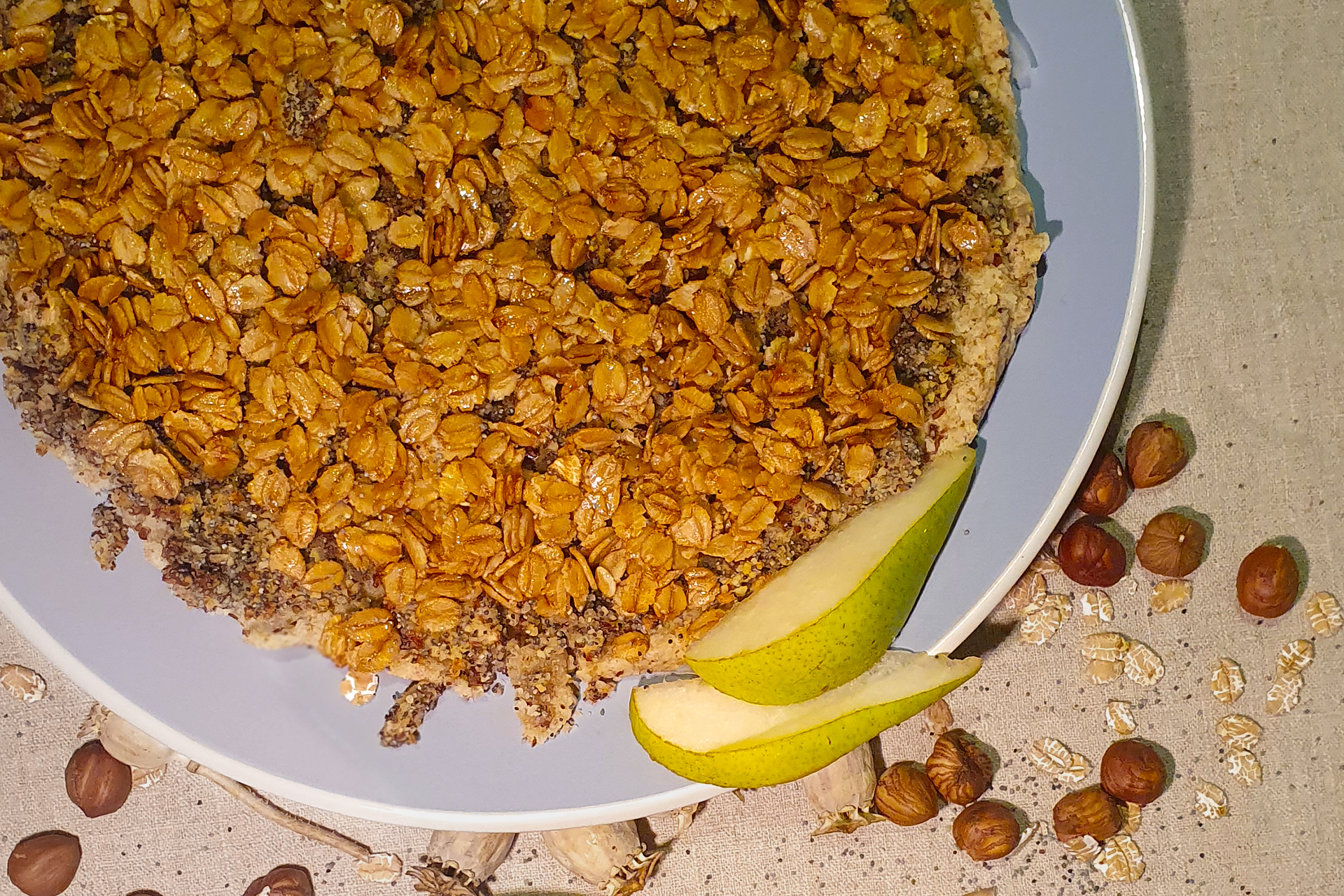 Milch oder Eier standen den Pfahlbauer*innen im Winter nicht zu Verfügung. Im Alpenraum ist das eine ganz schön lange Zeit ohne Kuchen. Diesen kann man aber auch aus anderen Zutaten backen – solchen, welche die Pfahlbauer-Bäcker*innen schon das ganze Jahr in der Vorratskammer hatten. Wir backen den köstlichen Kuchenboden aus Griess und belegen ihn einfach mit dem, was noch vorrätig ist. In diesem Rezept ist das eine dicke Schicht aus Birnen, Nüssen und Mohn. Oben drauf kommen mit Honig gesüsste knusprige Getreideflocken und fertig ist dieser perfekte Pfahlbauer*innen-Kuchen.
