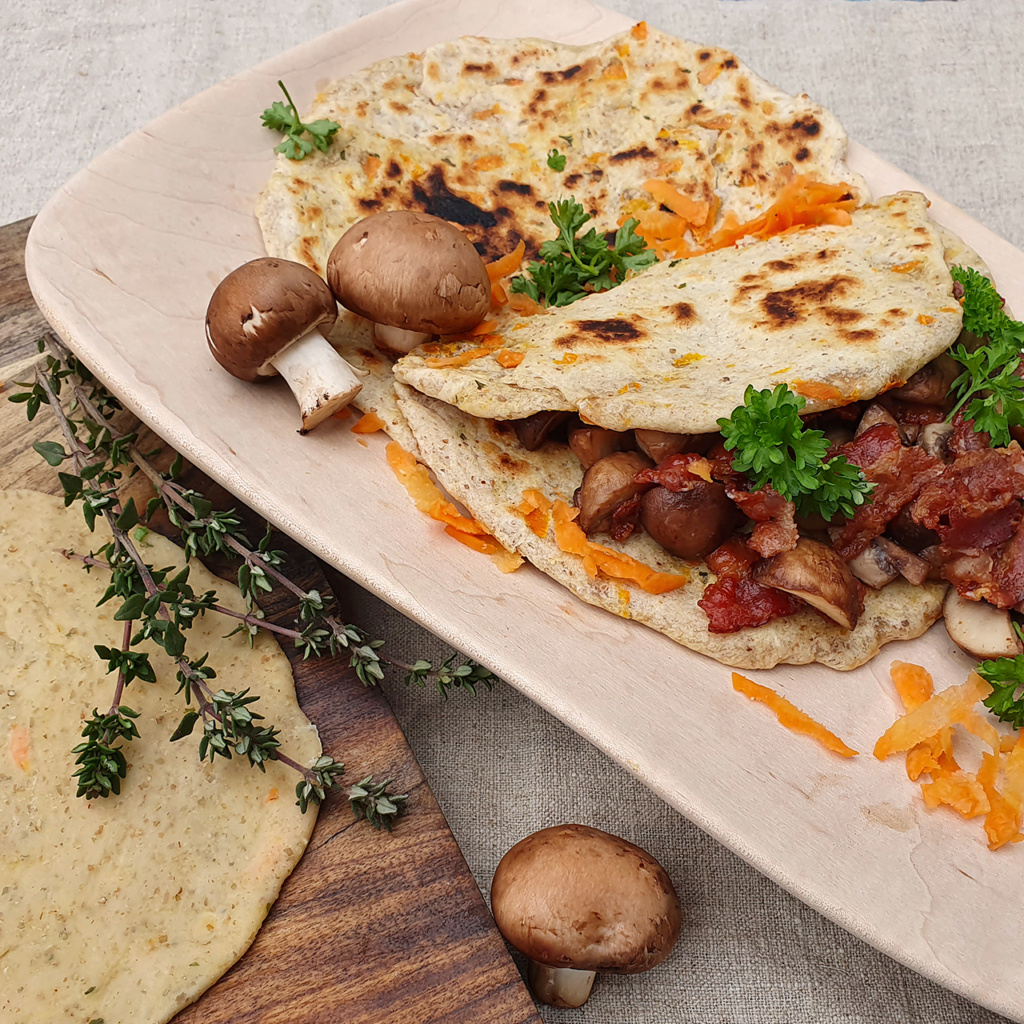 Anstelle der gebratenen Pilze kann man auch Trockenfleisch oder Rohessspeck auf eine Hälfte des Fladens geben. Umklappen und fertig ist das lauwarme Sandwich.