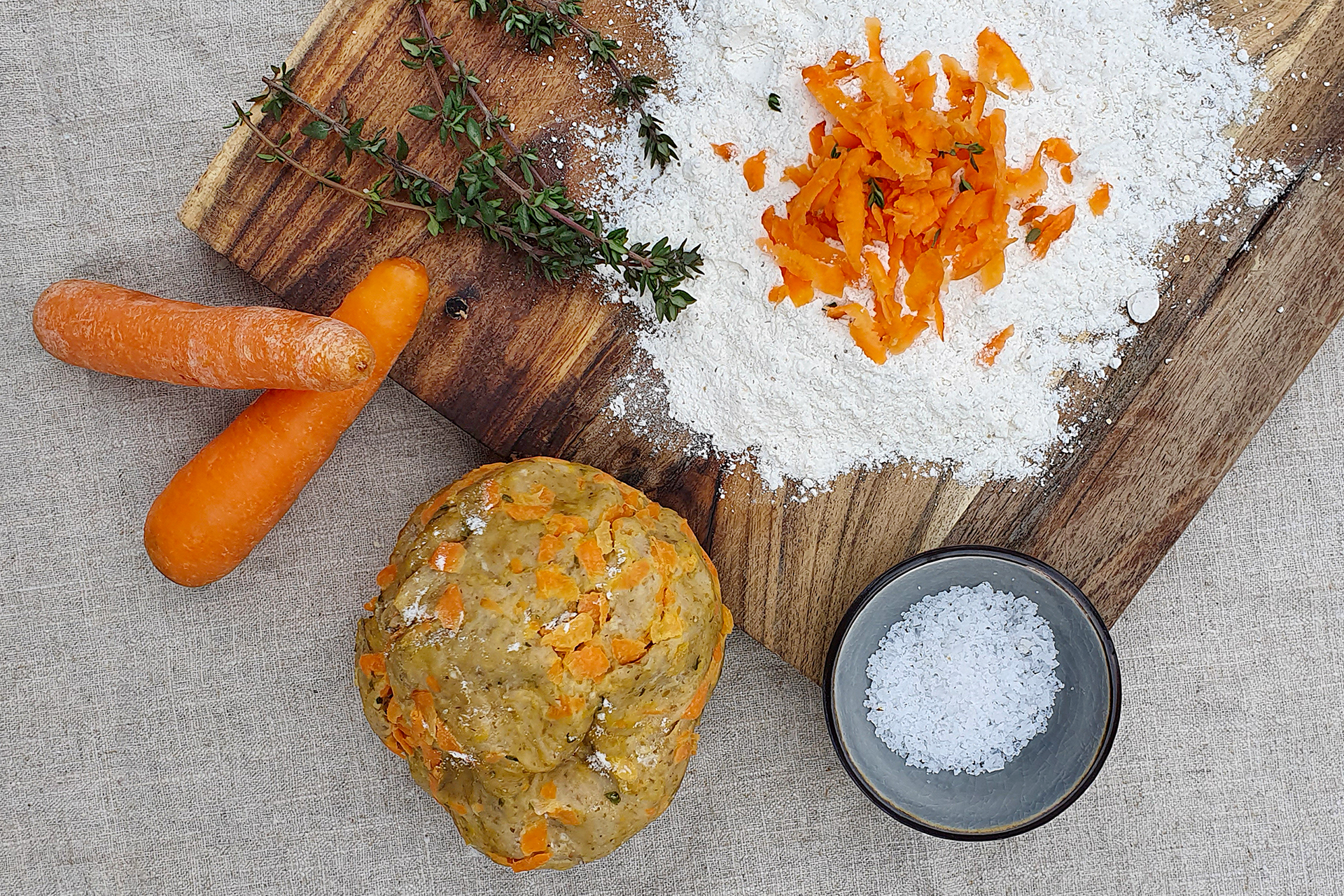 Mehl mit Wasser, ein wenig Öl und Salz zu einem Teig verkneten. Geraffelte Rüebli und ein paar Blättchen Thymian daruntermischen. Den Teig etwas stehen lassen.