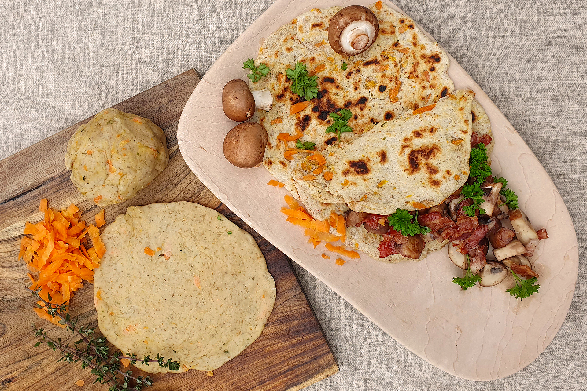 Anstelle der gebratenen Pilze kann man auch Trockenfleisch oder Rohessspeck auf eine Hälfte des Fladens geben. Umklappen und fertig ist das lauwarme Sandwich.