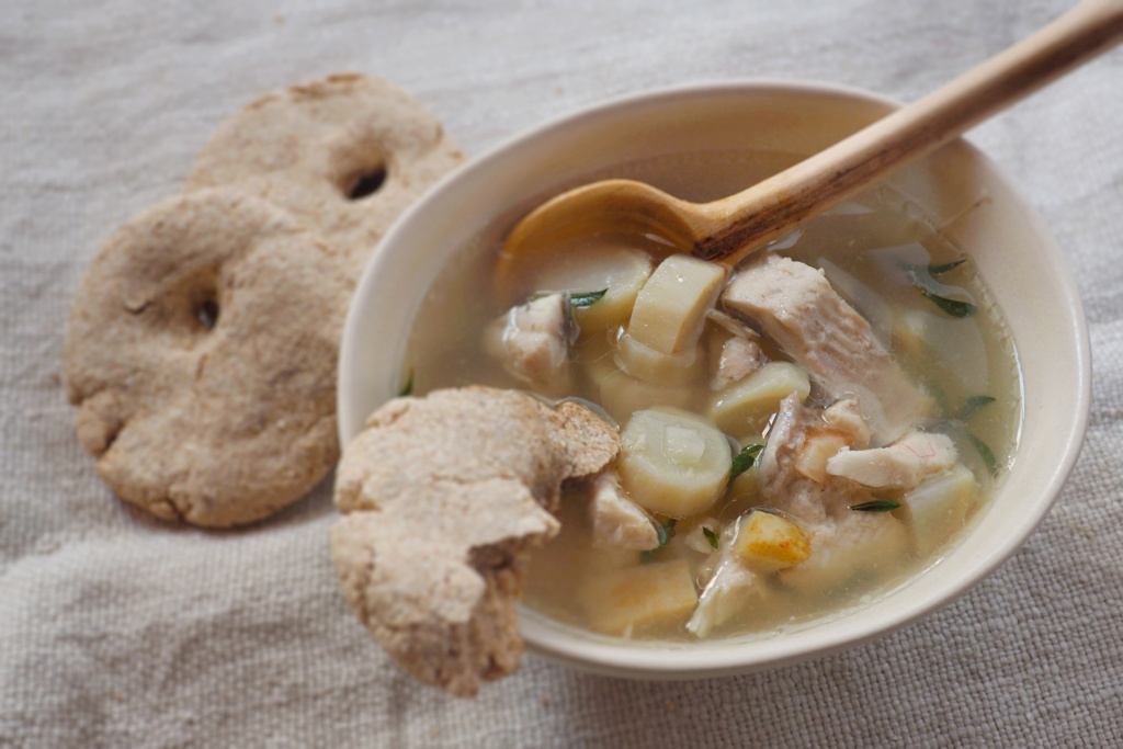 Zur Suppe passt selbst gebackenes Gerstenfladenbrot. Wenn dieses schon hart ist, einfach in die Suppe tunken.