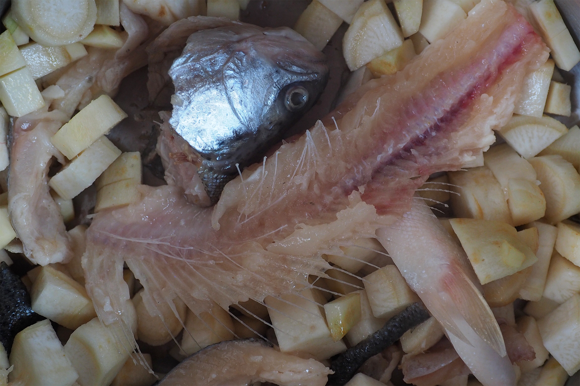 Eine Fischflosse in einem verkrusteten Kochtopf aus der Fundstelle Arbon im Kanton Thurgau, hat uns zu diesem Rezept inspiriert. Einen Schönheitspreis gewinnt die weisse Fischsuppe höchstens von Puristen. Schlicht ist auch die Zutatenliste. Ganz anders der Geschmack: Wir kochen Kopf, Gräten und Flossen mit und verleihen der Suppe so eine kräftige Würze.