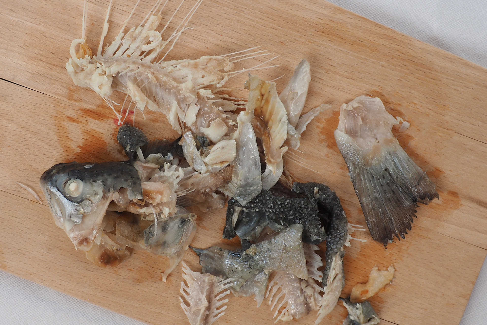 Gräten, Kopf und Flossen aus dem Topf fischen. Fleischstücke herauspräparieren und diese der Suppe wieder zufügen.