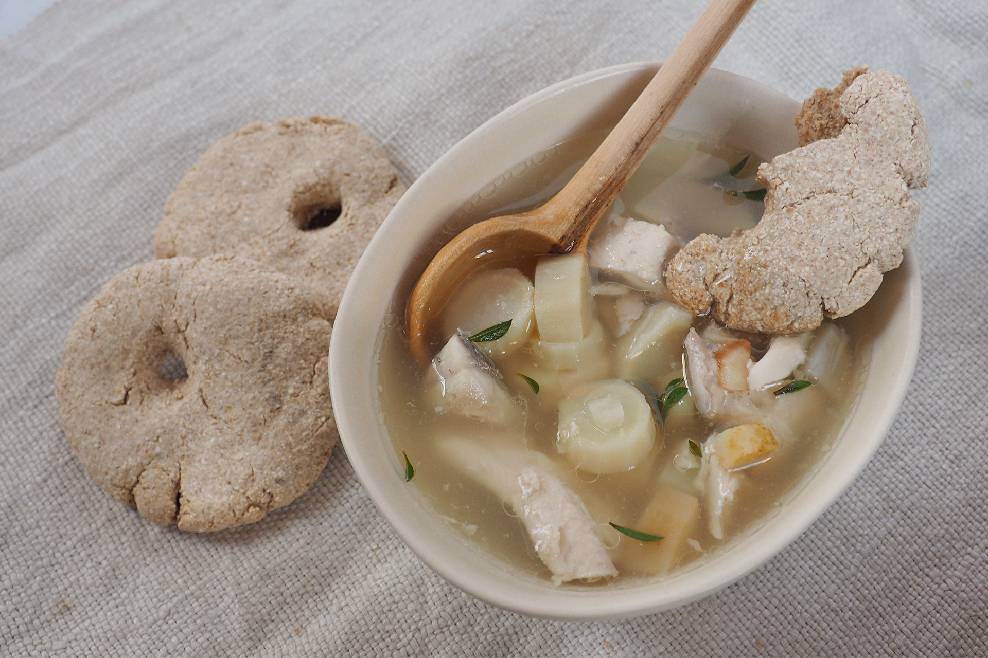 Zur Suppe passt selbst gebackenes Gerstenfladenbrot. Wenn dieses schon hart ist, einfach in die Suppe tunken.