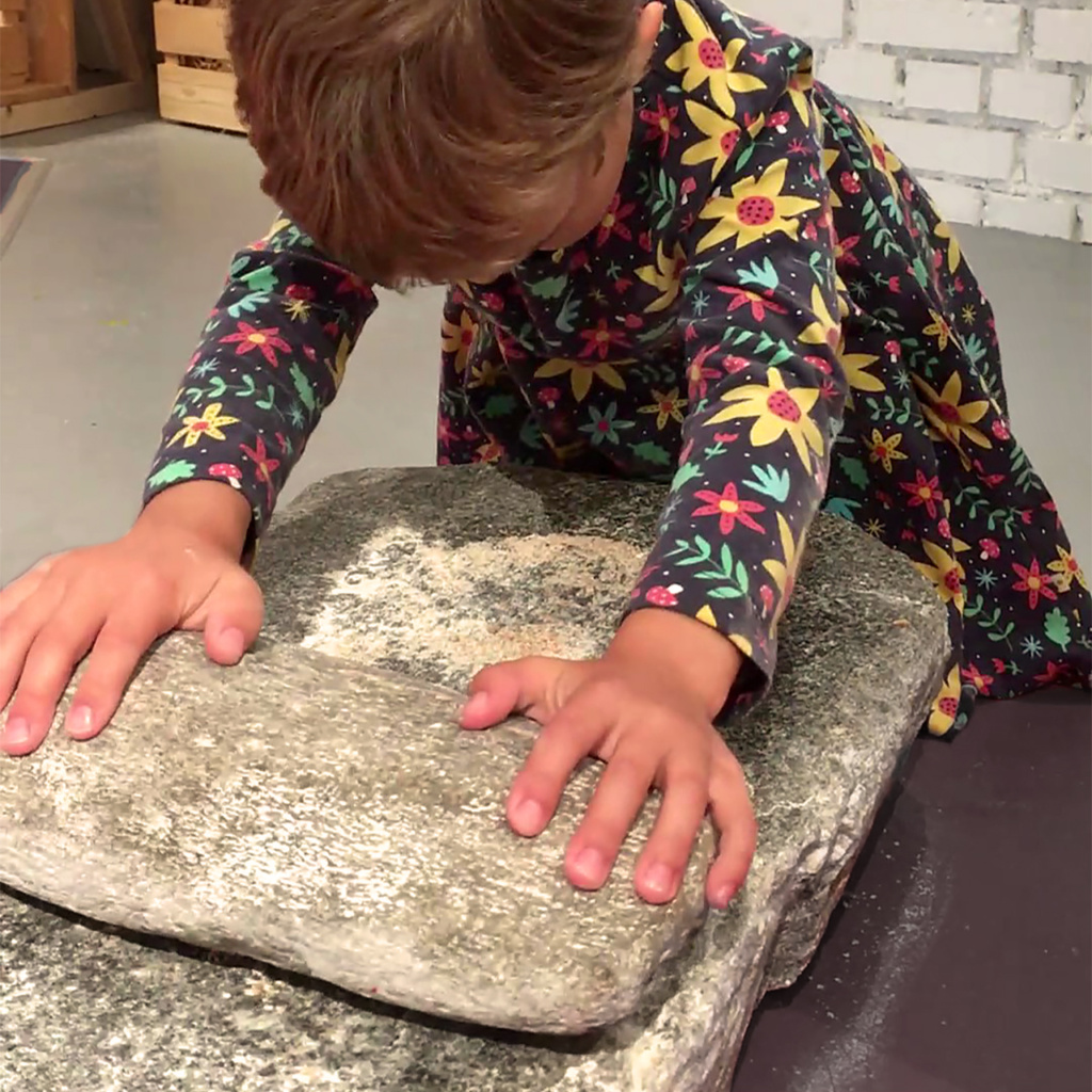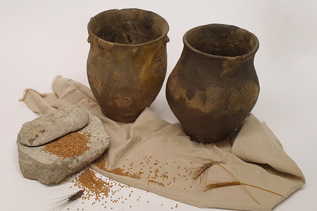 Heute werden aus Brotgetreide Dutzende verschiedene «Mahlprodukte» hergestellt, nicht nur unterschiedliche Mehlarten, sondern auch Schrot oder eben Griess. Die fast schon verwirrende Vielzahl der Erzeugnisse wird allen bewusst, die im Supermarkt vor dem Regal stehen, oder wenn im Rezept ein ganz bestimmter Typ Mehl gefragt ist. Je niedriger die Typen-Zahl, desto weniger ist vom ganzen Korn enthalten. In einem Weissmehl vom Typ 550 steckt nur das Innerste vom Getreidekorn, in einem Ruchmehl sind immerhin noch bis zu 85 % des ganzen Korns enthalten. Wie hielten es die Pfahlbauer*innen? Kannten sie nur Ruchmehl? Normierte Mahltypen gab es sicher nicht. Dennoch lassen sich mit den damals zur Verfügung stehenden Gerätschaften verschiedene Produkte herstellen. Handmühlen gehörten zum typischen Hausinventar; sie standen in oder direkt vor den Häusern. Man streute die Körner auf die schweren, grossen Steinplatten und verrieb sie mit einem kleineren Reibstein. Vom groben Schrot bis zum feinen Mehl lassen sich so alle Mahlgrade mit mehr oder weniger Aufwand herstellen.